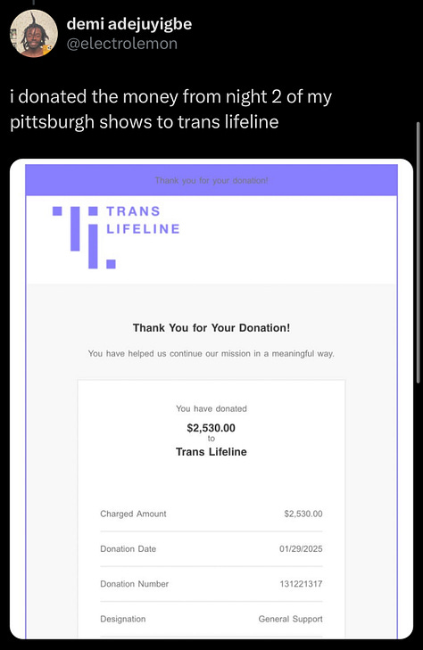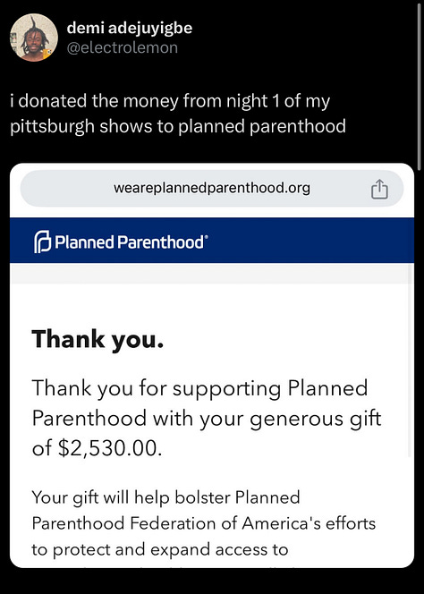 As our GOP leaders cut away at trans rights3 and reproductive rights4, there are people like comedian and writer Demi Adejuyigbe, who took to X/Twitter to announce that the money from his two most recent shows were donated to Trans Lifeline and Planned Parenthood.